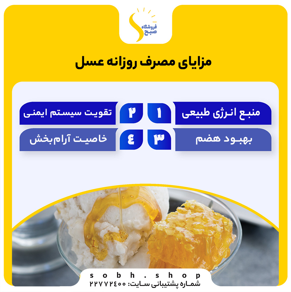 - تقویت سیستم ایمنی: عسل دارای خواص ضدباکتریایی و ضدالتهابی است که میتواند به تقویت سیستم ایمنی کمک کند. مصرف روزانه آن میتواند به کاهش خطر ابتلا به عفونتها و بیماریها کمک کند.