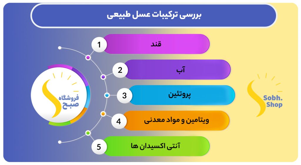 اولین سوالی که در پاسخ به سوال آیا عسل طبیعی قند دارد؟  باید بدهیم، بررسی ترکیبات عسل است. عسل طبیعی حاوی مجموعه‌ای از ترکیبات مغذی است که آن را به یک ماده غذایی خاص تبدیل می‌کند. عمده‌ترین ترکیبات عسل شامل موارد زیر هستند: