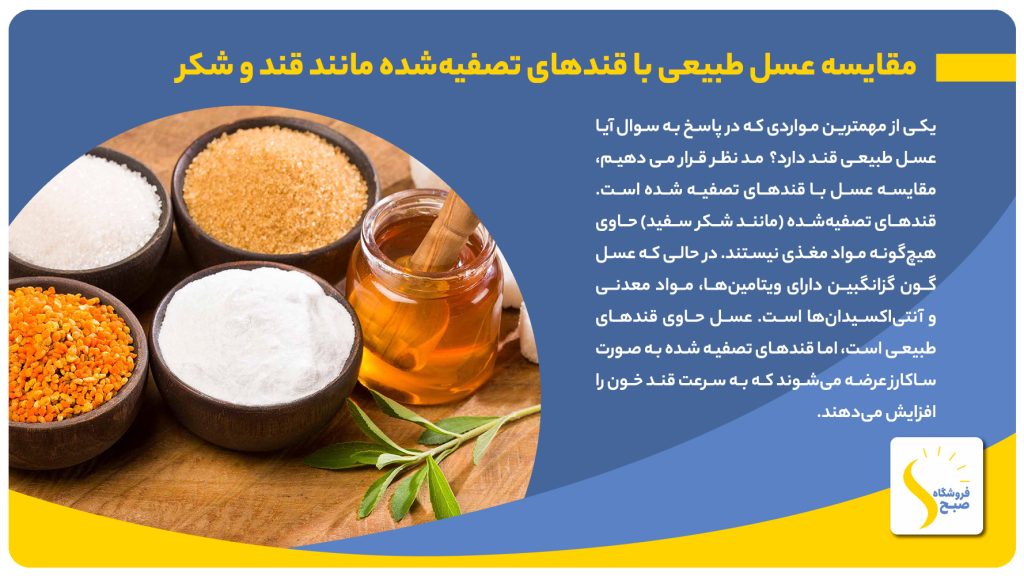 مقایسه عسل طبیعی با قندهای تصفیه‌شده مانند قند و شکر