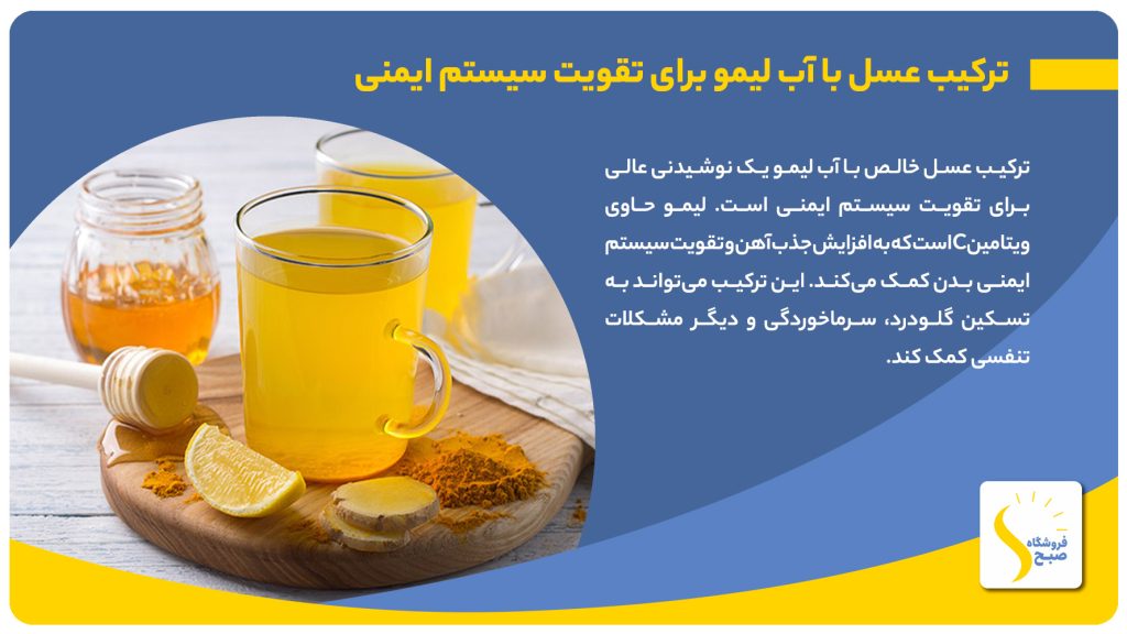 - ترکیب با آب لیمو برای تقویت سیستم ایمنی: ترکیب عسل خالص با آب لیمو یک نوشیدنی عالی برای تقویت سیستم ایمنی است. لیمو حاوی ویتامین C است که به افزایش جذب آهن و تقویت سیستم ایمنی بدن کمک میکند. این ترکیب میتواند به تسکین گلودرد، سرماخوردگی و دیگر مشکلات تنفسی کمک کند.