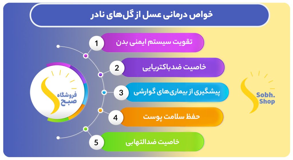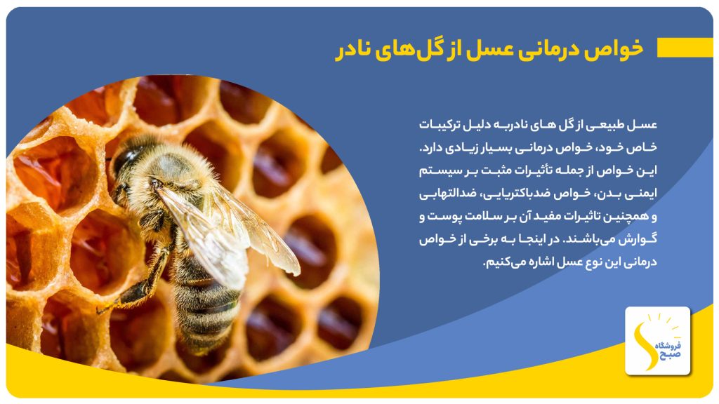 عسل طبیعی از گل های نادربه دلیل ترکیبات خاص خود، خواص درمانی بسیار زیادی دارد. این خواص از جمله تأثیرات مثبت بر سیستم ایمنی بدن، خواص ضدباکتریایی، ضدالتهابی و همچنین تاثیرات مفید آن بر سلامت پوست و گوارش می‌باشند. در اینجا به برخی از خواص درمانی این نوع عسل اشاره می‌کنیم.