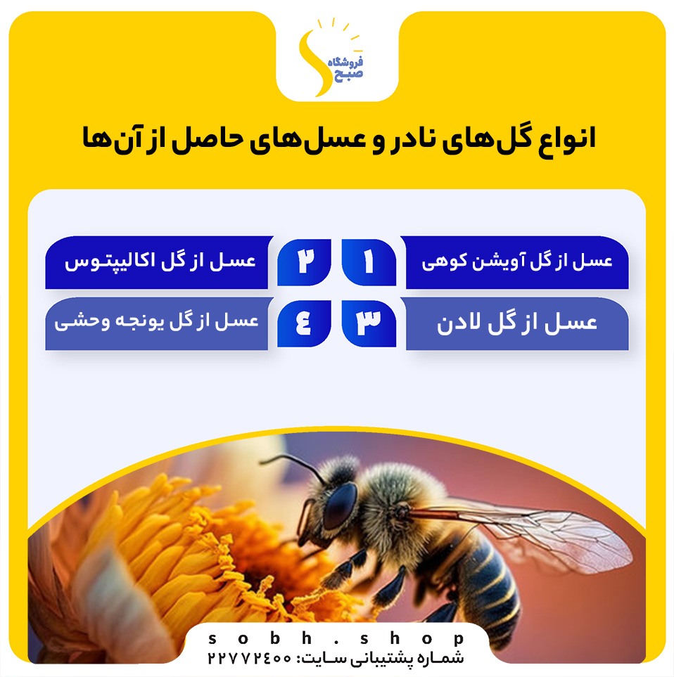 عسل از گل های نادرمی‌تواند از گل‌های مختلفی به دست آید که هر یک خواص خاص خود را دارند. در اینجا به معرفی چند نوع گل نادر و عسل‌های حاصل از آن‌ها پرداخته‌ایم: