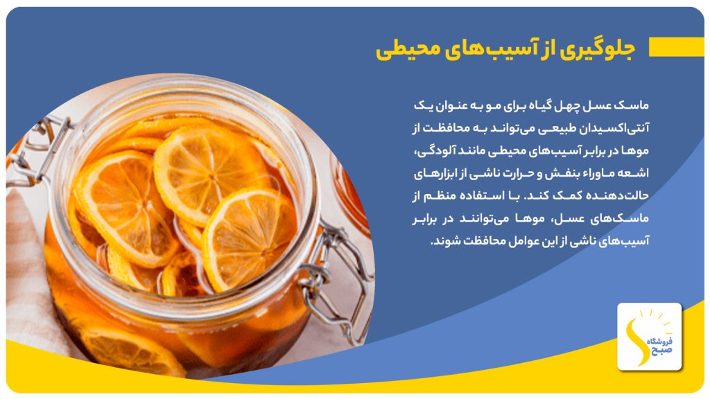 ماسک عسل چهل گیاه برای مو به عنوان یک آنتیاکسیدان طبیعی میتواند به محافظت از موها در برابر آسیبهای محیطی مانند آلودگی، اشعه ماوراء بنفش و حرارت ناشی از ابزارهای حالتدهنده کمک کند. با استفاده منظم از ماسکهای عسل، موها میتوانند در برابر آسیبهای ناشی از این عوامل محافظت شوند.