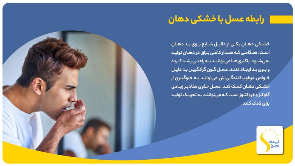 خشکی دهان یکی از دلایل شایع بوی بد دهان است. هنگامی که مقدار کافی بزاق در دهان تولید نمی‌شود، باکتری‌ها می‌توانند به راحتی رشد کرده و بوی بد ایجاد کنند. عسل گون گزانگبین به دلیل خواص مرطوب‌کنندگی‌اش می‌تواند به جلوگیری از خشکی دهان کمک کند. عسل حاوی مقادیر زیادی گلوکز و فروکتوز است که می‌توانند به تحریک تولید بزاق کمک کنند.
