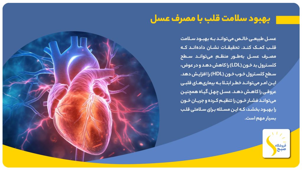 عسل طبیعی خالص می‌تواند به بهبود سلامت قلب کمک کند. تحقیقات نشان داده‌اند که مصرف عسل به‌طور منظم می‌تواند سطح کلسترول بد خون (LDL) را کاهش دهد و در عوض، سطح کلسترول خوب خون (HDL) را افزایش دهد. این امر می‌تواند خطر ابتلا به بیماری‌های قلبی عروقی را کاهش دهد. عسل چهل گیاه همچنین می‌تواند فشار خون را تنظیم کرده و جریان خون را بهبود بخشد، که این مسئله برای سلامتی قلب بسیار مهم است.