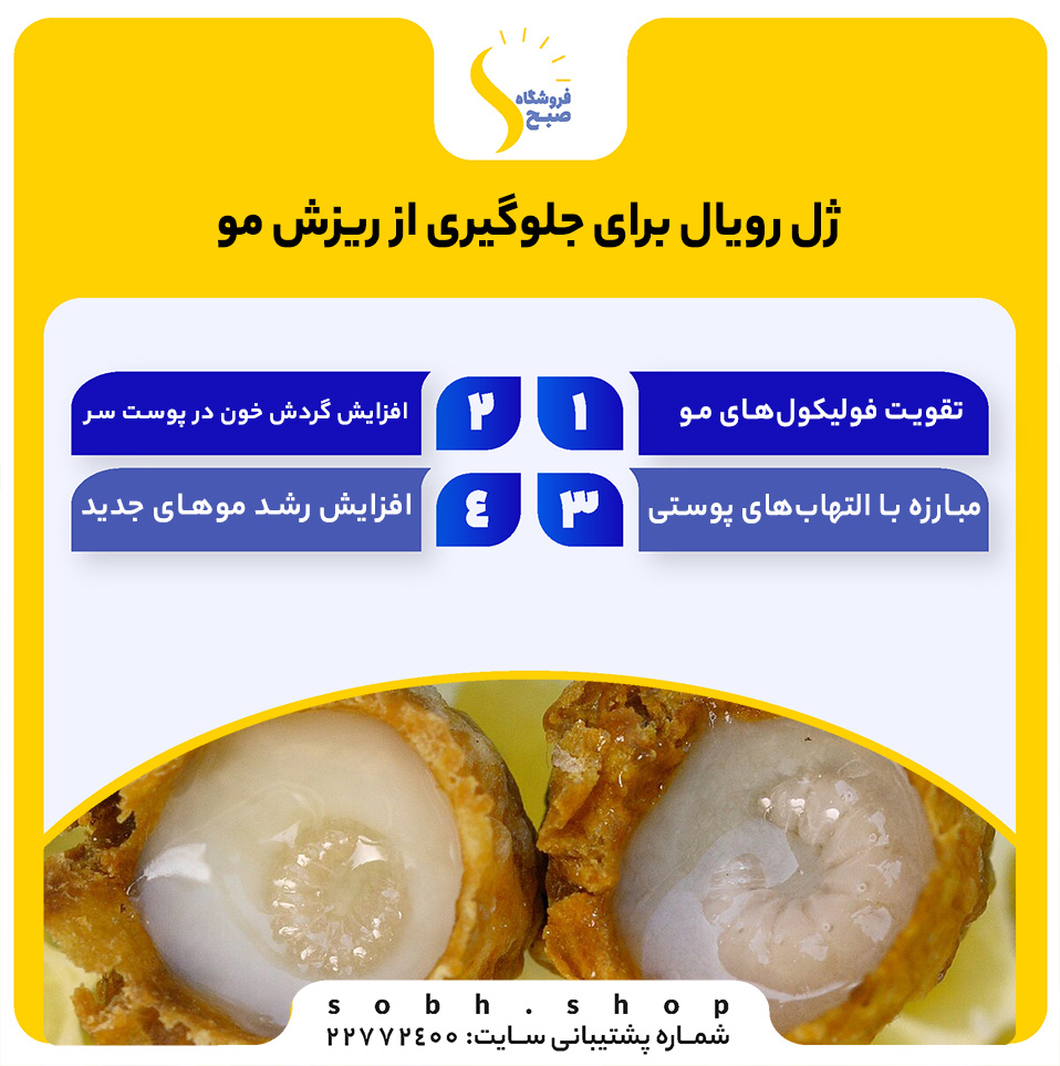 ژل رویال به دلیل داشتن ترکیبات مغذی مانند پروتئینها و اسیدهای آمینه، به تقویت فولیکولهای مو کمک میکند. فولیکولهای مو، ساختارهایی هستند که ریشه مو در آنها قرار دارد و از آنها تغذیه میکند. با تغذیه مناسب فولیکولها، موها قویتر و سالمتر میشوند. ژل رویال برای جلوگیری از ریزش مو میتواند به رشد موهای جدید کمک کند.