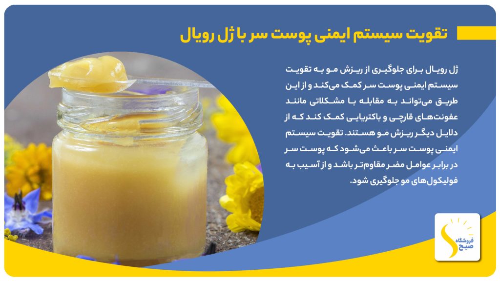 ژل رویال برای جلوگیری از ریزش مو به تقویت سیستم ایمنی پوست سر کمک میکند و از این طریق میتواند به مقابله با مشکلاتی مانند عفونتهای قارچی و باکتریایی کمک کند که از دلایل دیگر ریزش مو هستند. تقویت سیستم ایمنی پوست سر باعث میشود که پوست سر در برابر عوامل مضر مقاومتر باشد و از آسیب به فولیکولهای مو جلوگیری شود.