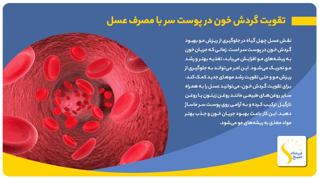 نقش عسل چهل گیاه در جلوگیری از ریزش مو بهبود گردش خون در پوست سر است. زمانی که جریان خون به ریشه‌های مو افزایش می‌یابد، تغذیه بهتر و رشد مو تحریک می‌شود. این امر می‌تواند به جلوگیری از ریزش مو و حتی تقویت رشد موهای جدید کمک کند. برای تقویت گردش خون، می‌توانید عسل را به همراه سایر روغن‌های طبیعی مانند روغن زیتون یا روغن نارگیل ترکیب کرده و به آرامی روی پوست سر ماساژ دهید. این کار باعث بهبود جریان خون و جذب بهتر مواد مغذی به ریشه‌های مو می‌شود.