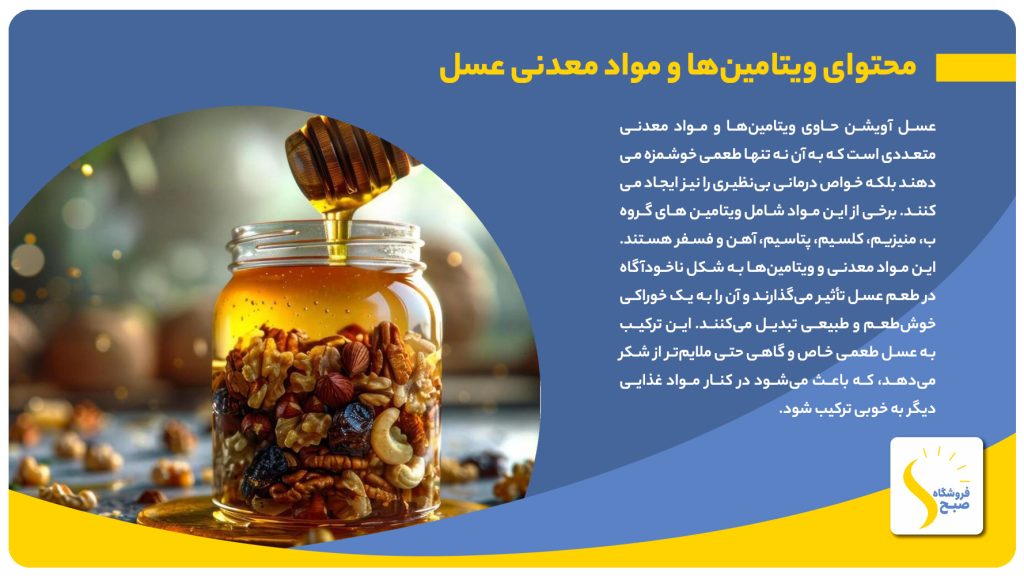 عسل آویشن حاوی ویتامین‌ها و مواد معدنی متعددی است که به آن نه تنها طعمی خوشمزه می‌دهند بلکه خواص درمانی بی‌نظیری را نیز ایجاد می‌کنند. برخی از این مواد شامل ویتامین های گروه ب، منیزیم، کلسیم، پتاسیم، آهن و فسفر هستند. این مواد معدنی و ویتامین‌ها به شکل ناخودآگاه در طعم عسل تأثیر می‌گذارند و آن را به یک خوراکی خوش‌طعم و طبیعی تبدیل می‌کنند. این ترکیب به عسل طعمی خاص و گاهی حتی ملایم‌تر از شکر می‌دهد، که باعث می‌شود در کنار مواد غذایی دیگر به خوبی ترکیب شود.